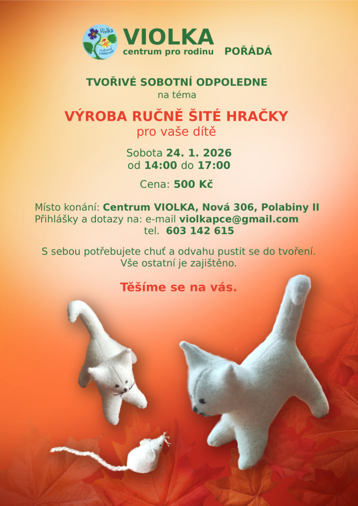 Připomínáme, že tvoření ve Violce – šití zvířátka je již tuto sobotu 8.11. a je potřeba se přihlásit na mail nebo mobil na letáčku do večera 6.11.